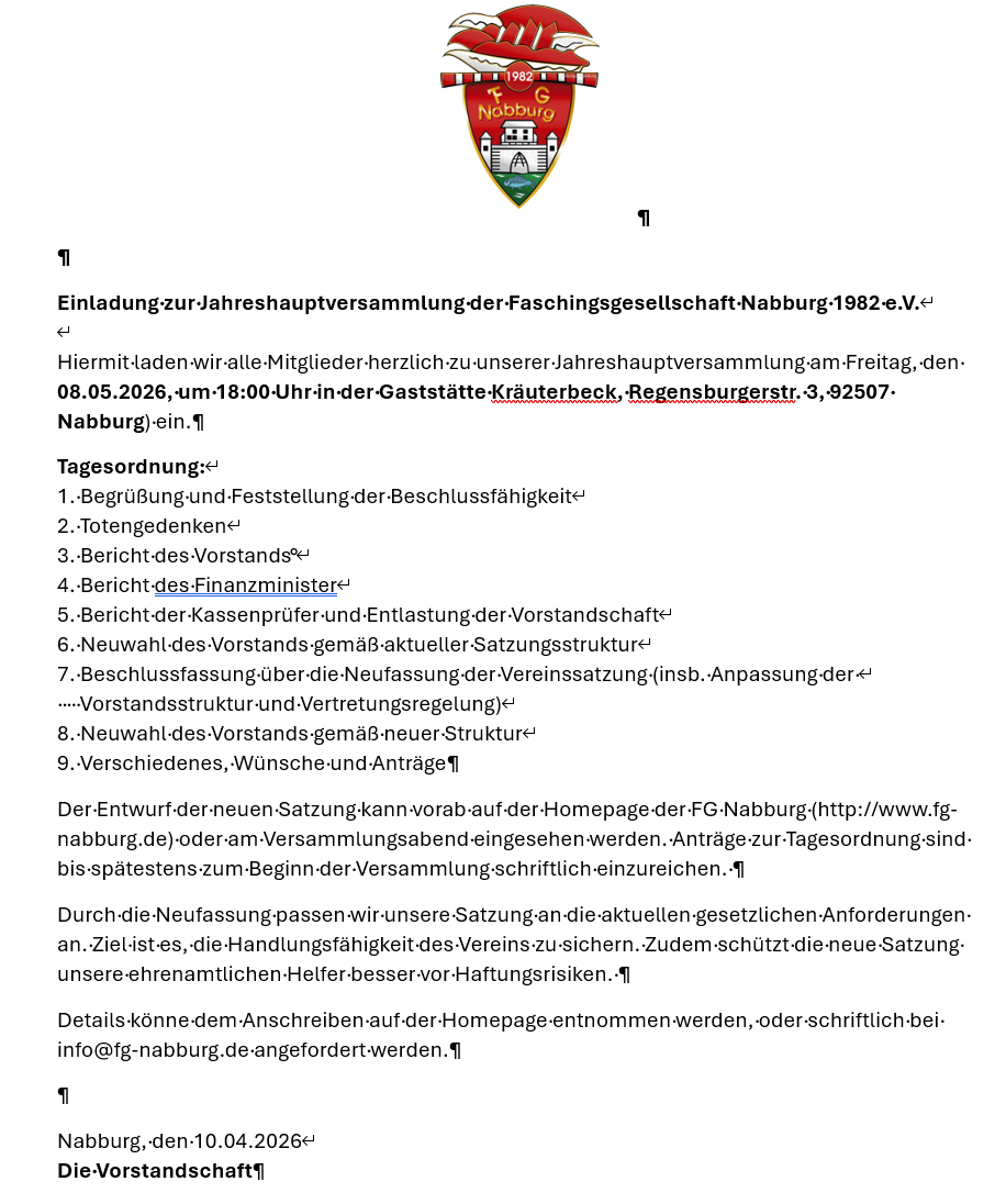 Wir, Faschingsgesellschaft Nabburg 1982 e.V. (Vereinssitz: Deutschland), verarbeiten zum Betrieb dieser Website personenbezogene Daten nur im technisch unbedingt notwendigen Umfang. Alle Details dazu in unserer Datenschutzerklärung.